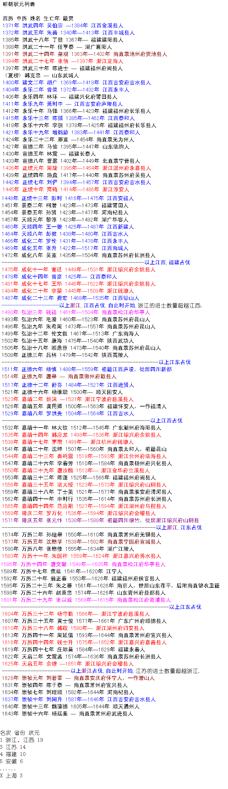 明前期即可与江西并驾齐驱,中期以后则大大超越,直至江苏崛起前,还独领风骚了一段时期。明清以后人物有刘基、方孝孺、于谦、徐文长、施耐庵、黄宗羲、王守仁(王阳明)、袁枚、章学诚、龚自珍等数不胜数。是故,浙江堪称名副其实文化大省。