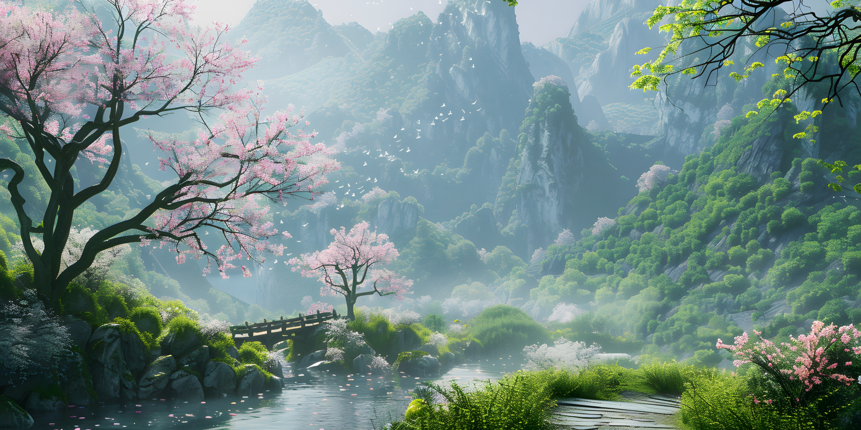 晋太元中,武陵人捕鱼为业。缘溪行,忘路之远近。忽逢桃花林,夹岸数百步,中无杂树,芳草鲜美,落英缤纷。渔人甚异之。复前行,欲穷其林。林尽水源,便得一山。山有小口,仿佛若有光。便舍船,从口入。初极狭,才通人。复行数十步,豁然开朗。土地平旷,屋舍俨然,有良田美池桑竹之属。阡陌交通,鸡犬相闻。其中往来种作,男女衣著,悉如外人。黄发垂髫,并怡然自乐。